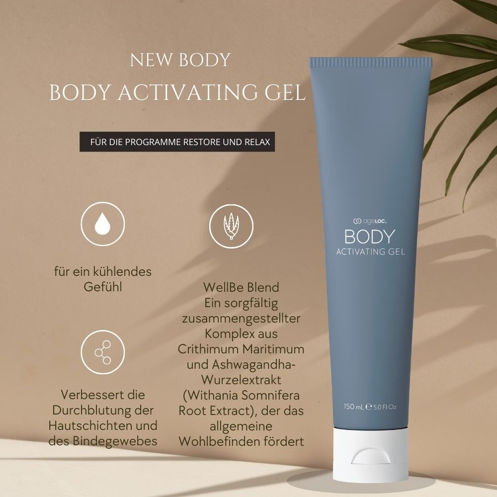 Tupfe deine Haut nach der Reinigung trocken und trage ageLOC Body Activating Gel auf die gewünschten Hautstellen auf. Verwende dazu dein ageLOC WellSpa iO Gerät. Bei der Restore-Routine lässt du das Gerät in langen, aufwärts gerichteten Bewegungen leicht über die Körperpartie gleiten. Anschließend das Gerät drehen, um den nächsten Abschnitt zu behandeln, bis der gesamte Körperbereich erfasst wurde. Überschüssiges Gel in die Haut einmassieren. Bis zu einmal täglich verwenden.