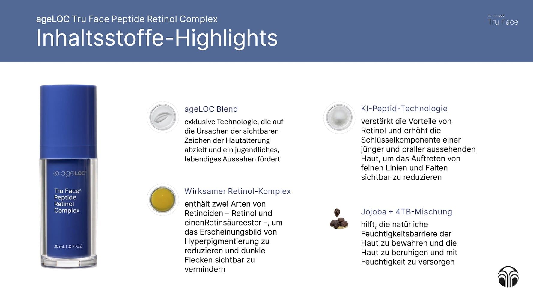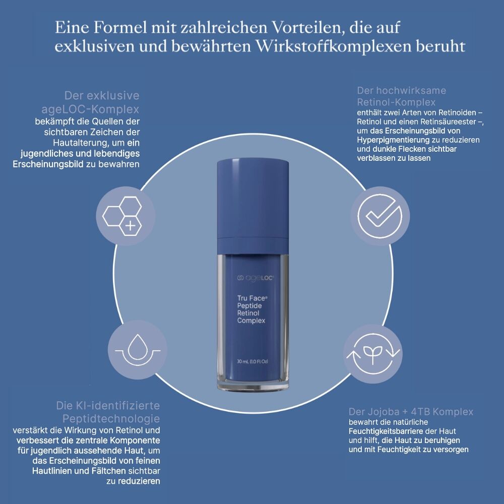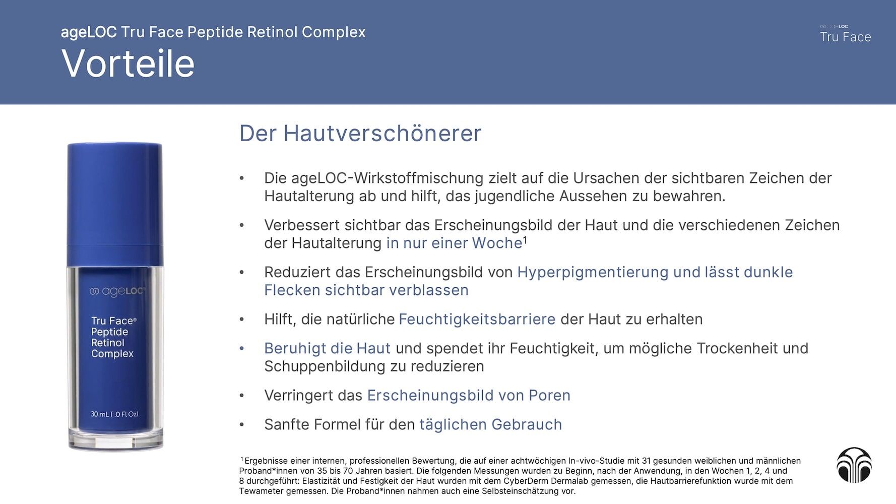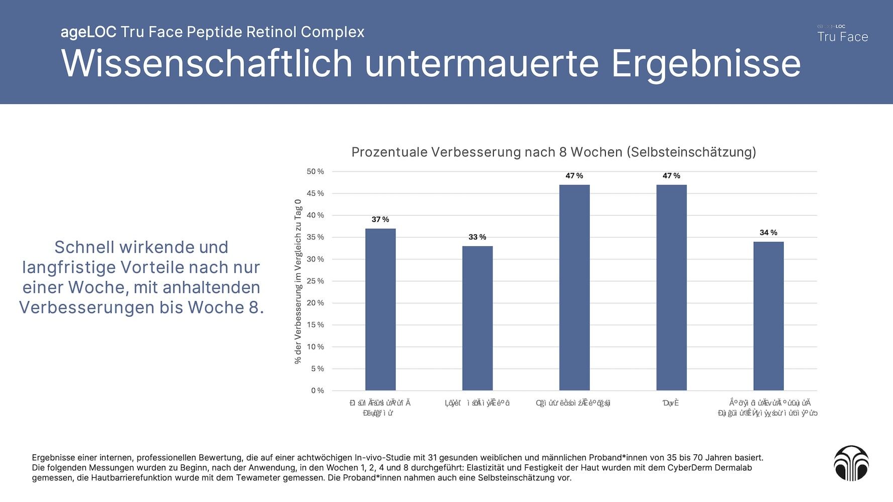 Bei einer intern durchgeführten klinischen In-vivo-Studie von Nu Skin trugen die 31 männlichen und weiblichen Teilnehmer im Alter zwischen 35 und 70 ageLOC Tru Face Peptide Retinol Complex im Zeitraum von 8 Wochen einmal am Abend auf die Haut auf.