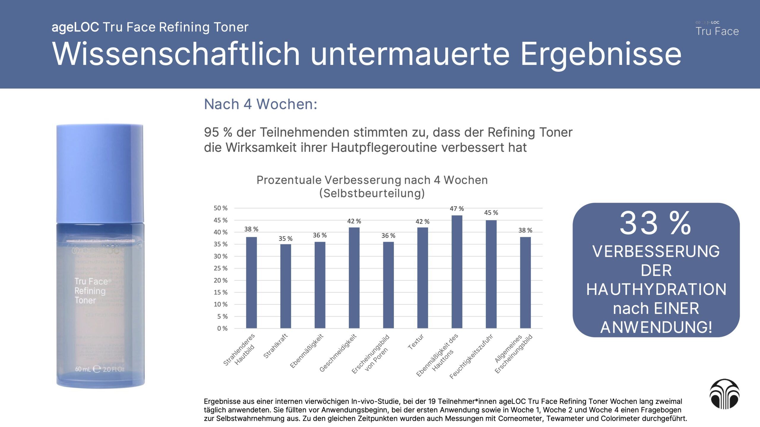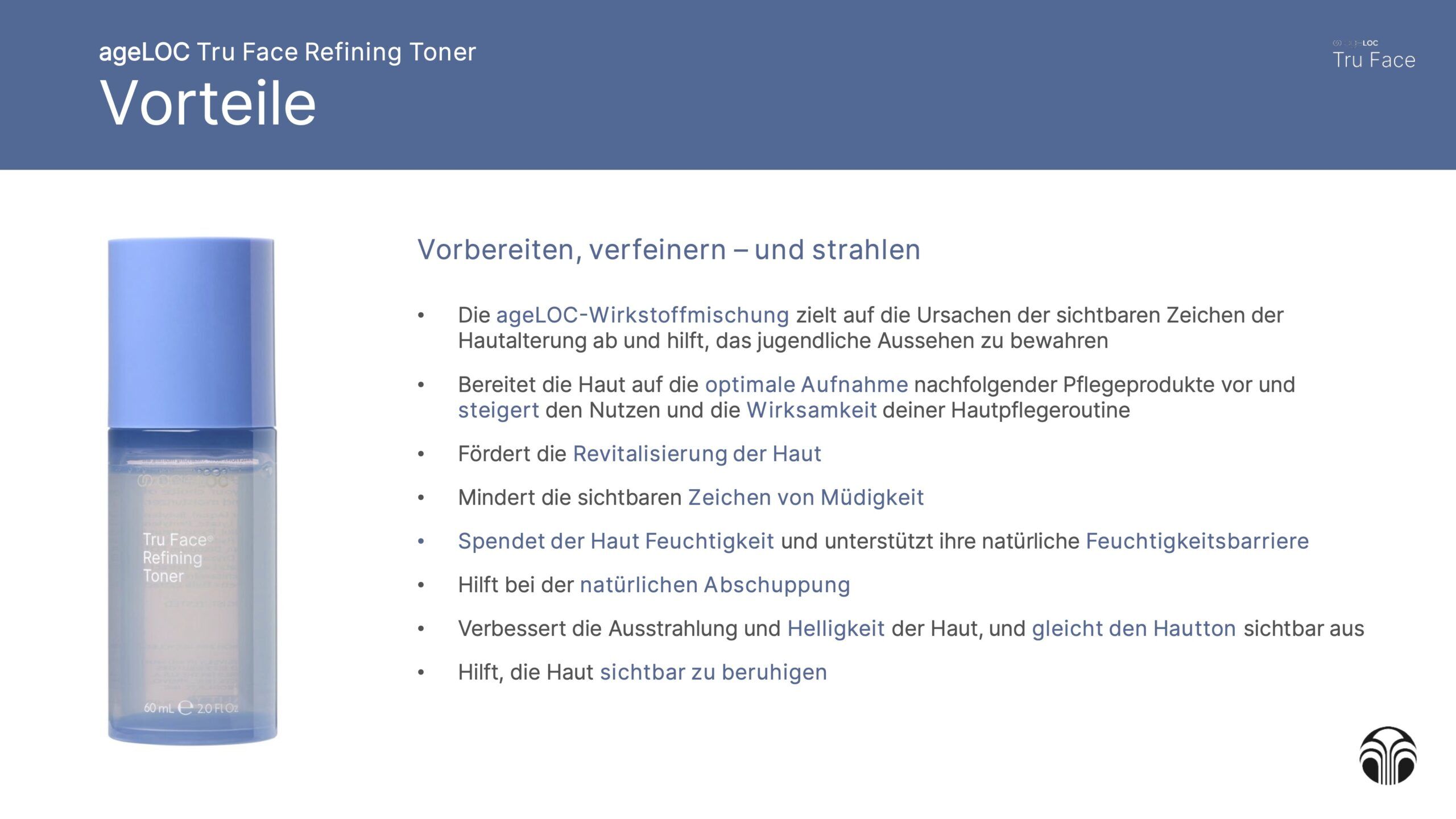 Dank der exklusiven ageLOC-Wirkstoffmischung wirkt der Refining Toner an den Ursachen sichtbarer Hautalterung. Der integrierte PrepPlus-Komplex verbessert die Aufnahmefähigkeit der Haut, sodass nachfolgende Pflegeprodukte noch besser wirken können.
