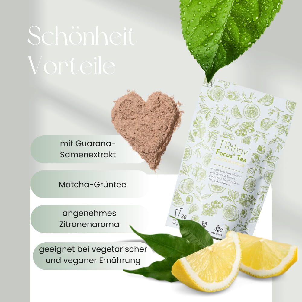 Zutaten: Maltodextrin, Guaranasamen-Extrakt (Paullinia cupana, 20 %), Hibiskusblütenpulver (Hibiscus sabdariffa L., 11 %), Zitronenaroma (11 %), Matcha-Grüntee-Pulver (Camellia sinensis (L.) Kuntze, 8,3 %), Orange-Pekoe-Tee-Extrakt (Camellia sinensis (L.) Kuntze, 5,6 %), Extrakt aus Blättern des grünen Tees (Camellia sinensis (L.) Kuntze, 5,6 %), Kardamomsamen-Extrakt (Elettaria cardamomum (L.) maton, 5,6 %), Geschmacksverstärker: Citronensäure, Süßungsmittel: Steviolglycoside aus Stevia.