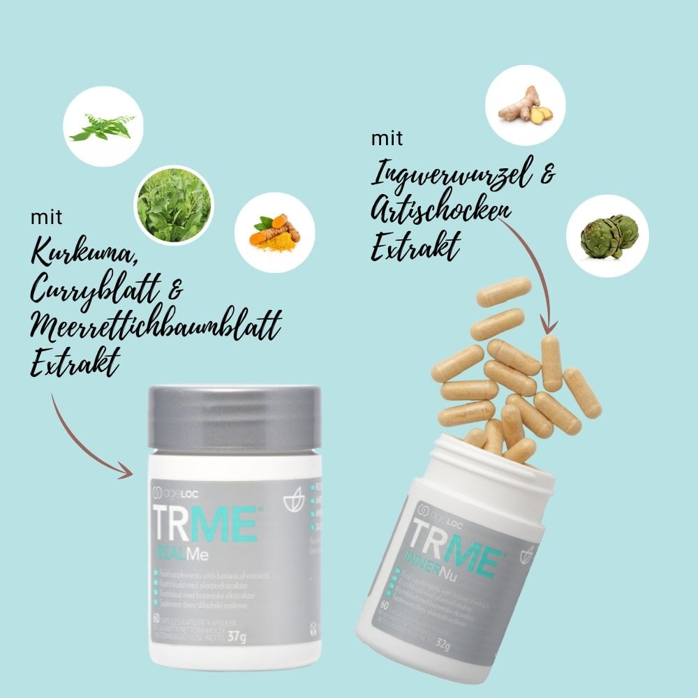 Zutaten RealMe: Meerrettichbaumblätter-Extrakt (Moringa oleifera Lam.) (540 mg/2 Kapseln), Curryblätter-Extrakt (Murraya koenigii (L.) Spreng) (270 mg/2 Kapseln), Kapsel: Hydroxypropylmethylcellulose, Füllstoff: mikrokristalline Cellulose, Kurkumawurzel-Extrakt (Curcuma longa L.) (90 mg/2 Kapseln), Trennmittel (Siliciumdioxid, Magnesiumsalze der Speisefettsäuren).